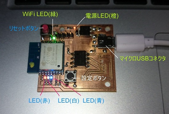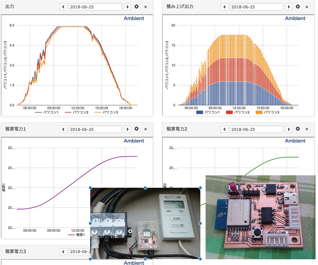 現状のシステムは一旦スマホを介してデータを送っているが、それだといろいろ敷居が高そうなのでプログラムを変更して、計測基板単体で無線LAN環境があれば、無料のIoTサービスのAmblietに発電量データが3分起きにあがるような基板を作成した。
